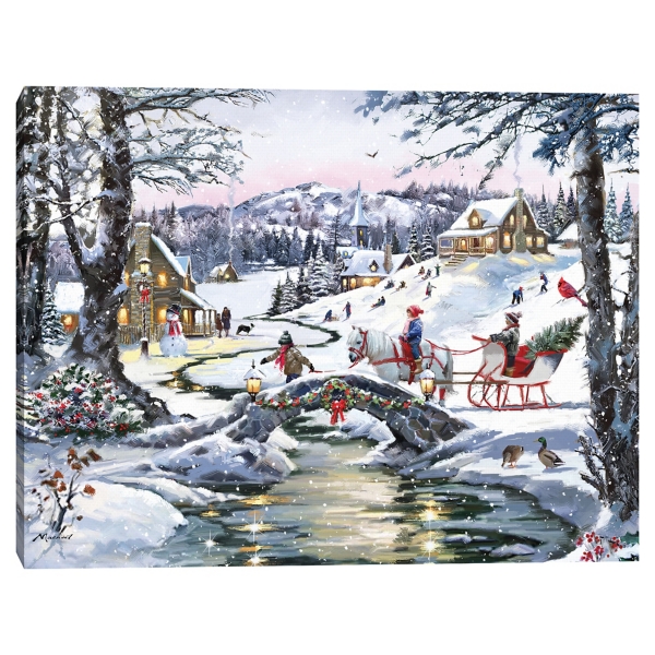 Make your home feel warm and cozy this holiday season with our Christmas Village Canvas Art Print! This snowy, picturesque village will bring Christmas joy to you and your guests! Canvas measures 28L x 22H in. Giclee printed on stretched, polycotton blend canvas Features a snowy village with a stream and a horse-drawn sleigh Hues of white, red, green, yellow, blue, gray, brown, and black Hanging hardware not included Weight: 7 lbs. Care: Dust with a soft, dry cloth. This item is available at Kirklands.com only, not available in stores. Please note: this item cannot be shipped to APO/FPO addresses. WARNING: This product can expose you to chemicals including titanium dioxide which is known to the State of California to cause cancer. For more information, go to www.P65Warnings.ca.gov/furniture.