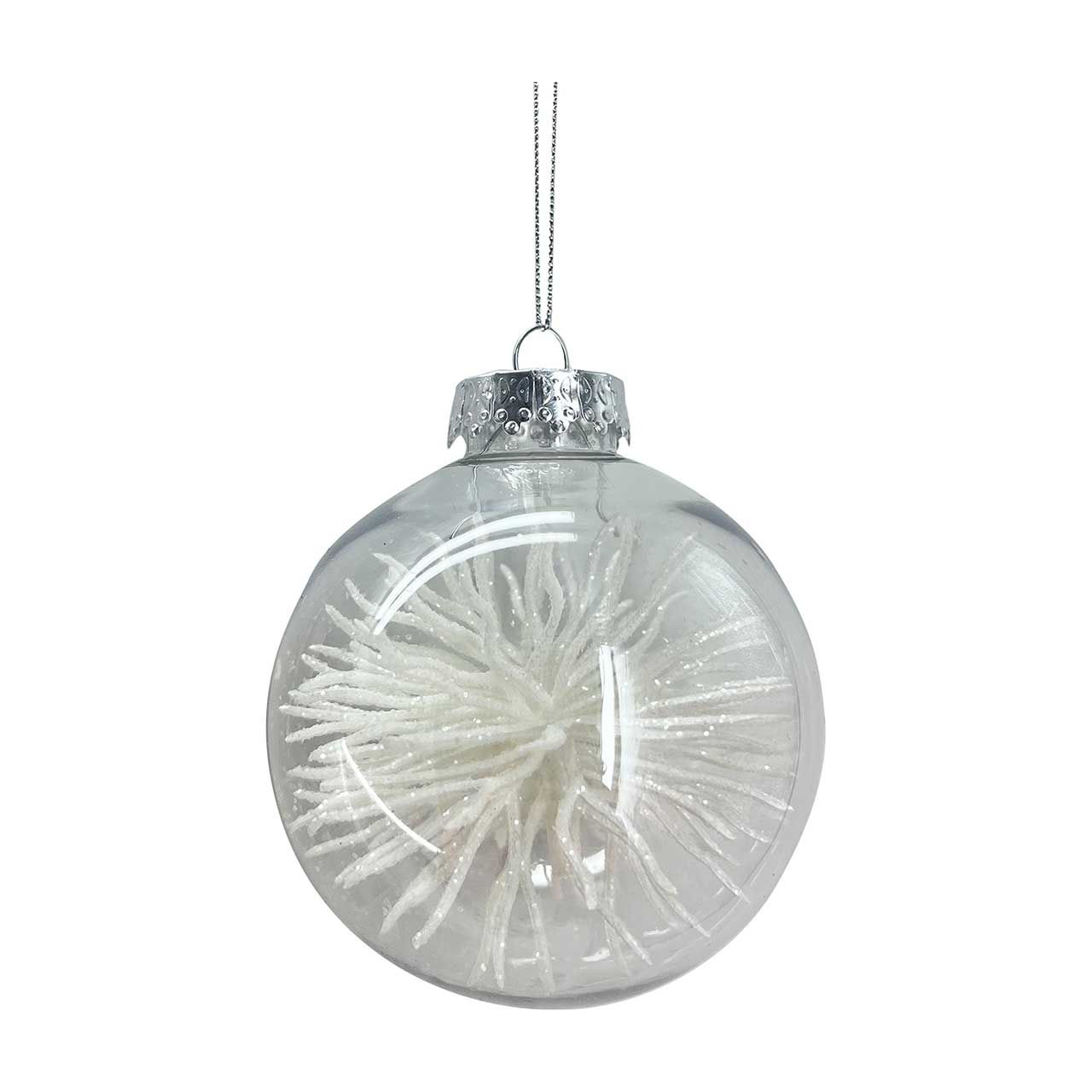 - Clear round bauble with an intricate white glitter spike inside