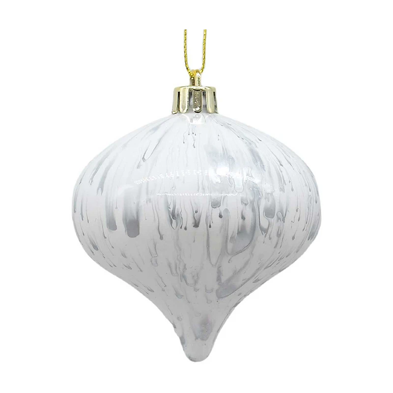 Add a touch of elegance and sophistication to your holiday decor with our stunning Christmas White with Silver Drop Ornament. This exquisite ornament features a unique teardrop shape that brings a contemporary twist to traditional Christmas tree decorations. Crafted with meticulous attention to detail, the ornament boasts a pristine white base adorned with delicate silver accents that create a beautiful, cascading effect. The silver detailing glistens under holiday lights, adding a shimmering, frosty charm to your Christmas tree. This drop ornament is the perfect size to stand out among your festive decorations without overpowering them. It comes with a secure gold cap and an attached hanging string, making it easy to place on branches, wreaths, or garlands. Made from high-quality, durable materials, this ornament is designed to last for many holiday seasons to come. Whether you're looking to refresh your tree with a sophisticated new look or searching for the perfect gift for a loved one, the Christmas White with Silver Drop Ornament is a timeless choice that embodies the magic and beauty of the season.