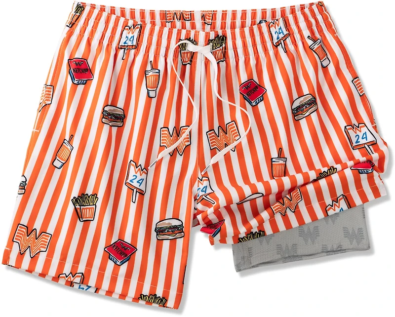 Represent your favorite food in these Chubbies Men's The Whataburger Comic Stripes Classic Lined Swim Trunks 5.5 in. They are made of 92% polyester and 8% spandex for a durable and stretchy material, and the trunks have an anti-chafe liner to help you stay comfortable in and out of the water.