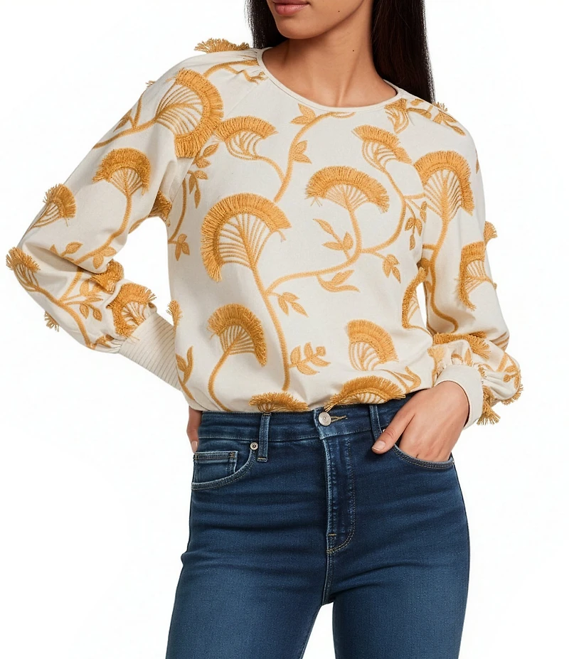 CIEBON Lenny 3D Floral Embroidered Linen Blend Round Neck Long Sleeve Bubble Hem Top in Chattanooga, TN
