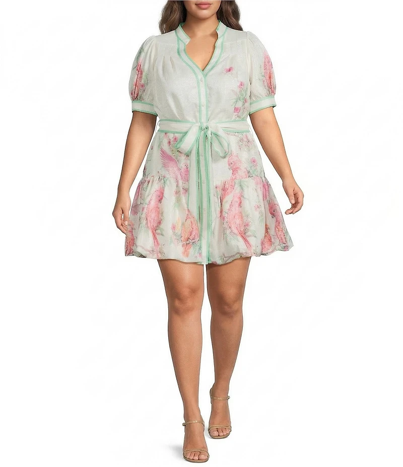 CIEBON Plus Size Ashton Bird Print Collared V-Neck Short Puff Sleeve Tiered Hem Belted A-Line Mini Dress