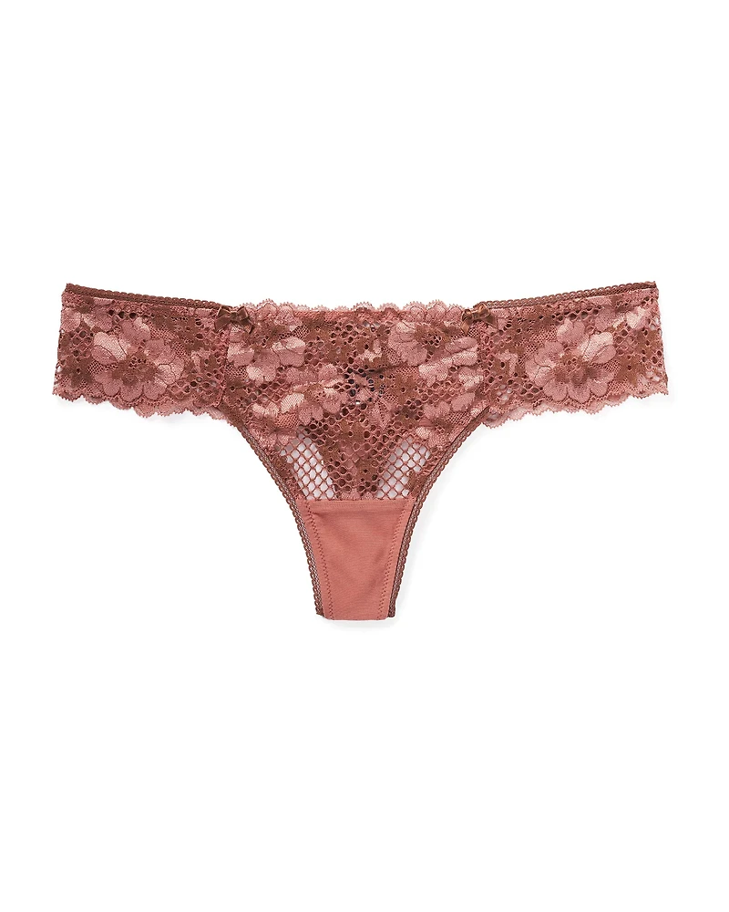 The Cinthia Thong Dark Brown lace thong is a romantic-essentials must-have. Effortlessly elegant, it features Thong Panty, Nylon/Spandex, Textured, cross-dyed lace, and Contrast trim and satin bows. (Available in sizes XS-XL.)