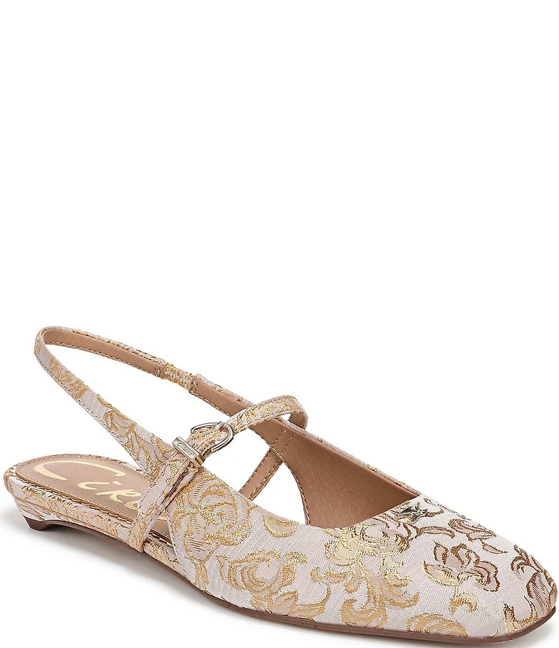 From Circus NY by Sam Edelman, the Elara Rosette Slingback Mary Jane Flats feature: Rosette fabric upper Square toe detailing Adjustable ankle strap Synthetic lining Synthetic outsole Approx. 0.6" heel height Imported.