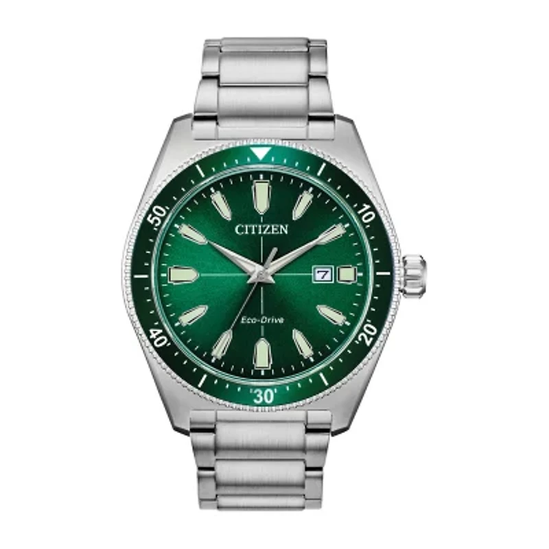 Nothing says classic better than a vintage throwback, and the redesigned Citizen Vintage Brycen Sport timepiece is just that, with distinguished features sure to stand out on your wrist. This stylish watch in a stainless steel case with pine green dial and bezel, stainless steel bracelet and date. Featuring our Eco-Drive technology – powered by light, any light. Never needs a battery. Caliber number J810.