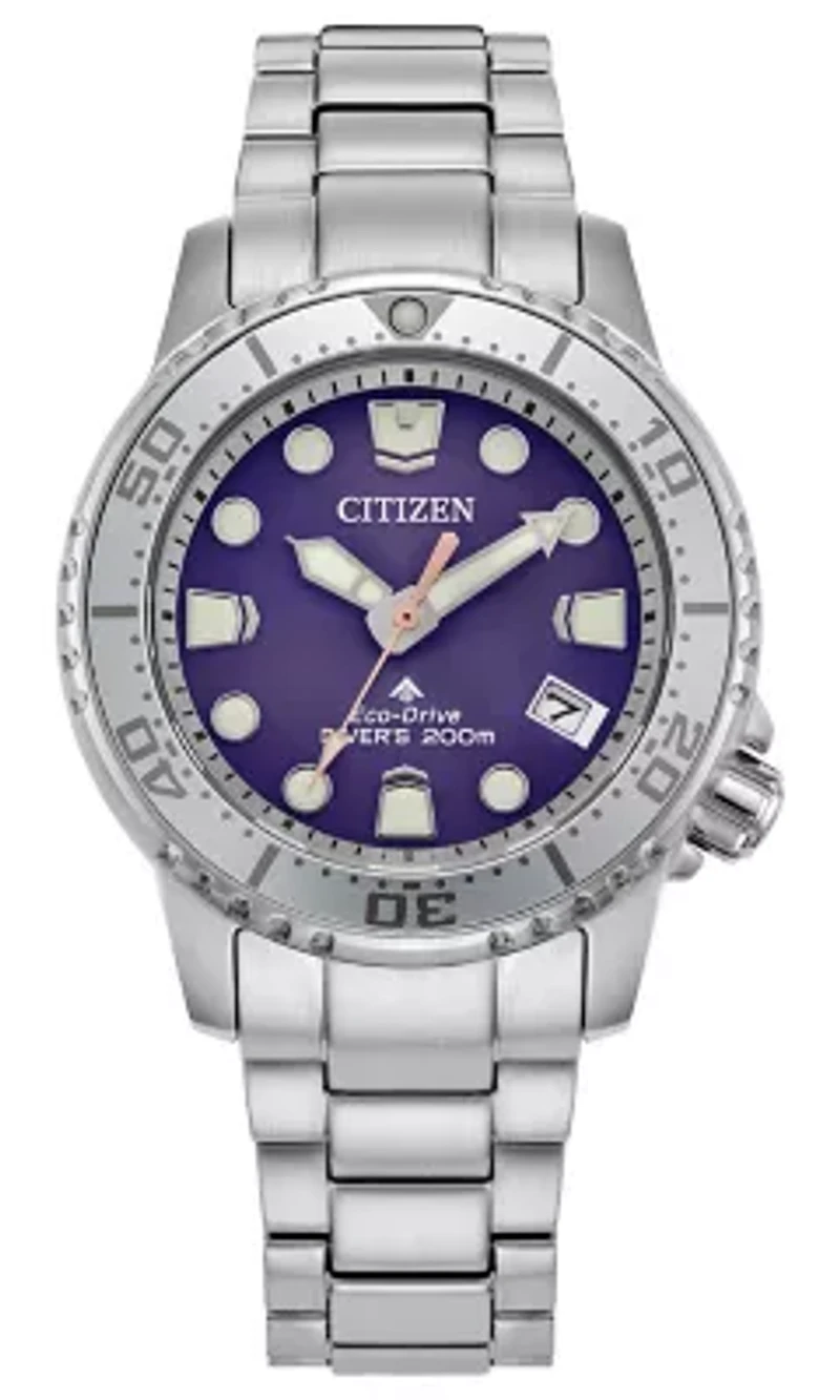 Submerge yourself in the latest Dive watch to join Citizen’s innovative Promaster line. The durable 37mm silver-tone stainless steel exterior comfortably fits wrists of all sizes, featuring an easy-grip uni-directional dive bezel and distinct crown at 4 o’clock. The monochromatic design is secured to the wrist via a case-matching silver-tone stainless steel bracelet. The sunray-textured, purple dial features oversized hands and applied markers that add to its high legibility, while accents of a bright luminous material ensure the quick reading of time even at the deepest depths. At the 4 o’clock position is a thoughtful date window, adding another element of functionality to this built-tough diver. Maintaining the robust standards of the Promaster Collection, the timepiece is ISO compliant and water resistant up to 200 meters. Sustainably powered by any light with Eco-Drive technology that never needs a battery, this stylish dive watch also comes in an exclusive collector’s scuba tank-inspired box. Caliber E168. Foldover clasp Chronograph dial Date display Warranty available, Limited liability warranty, 3 Years Limited liabilty warranty Imported Belk Exclusive Product Specifications 36.5mm Material & Care Metal, Titanium Clean with a damp cloth or soft brush.