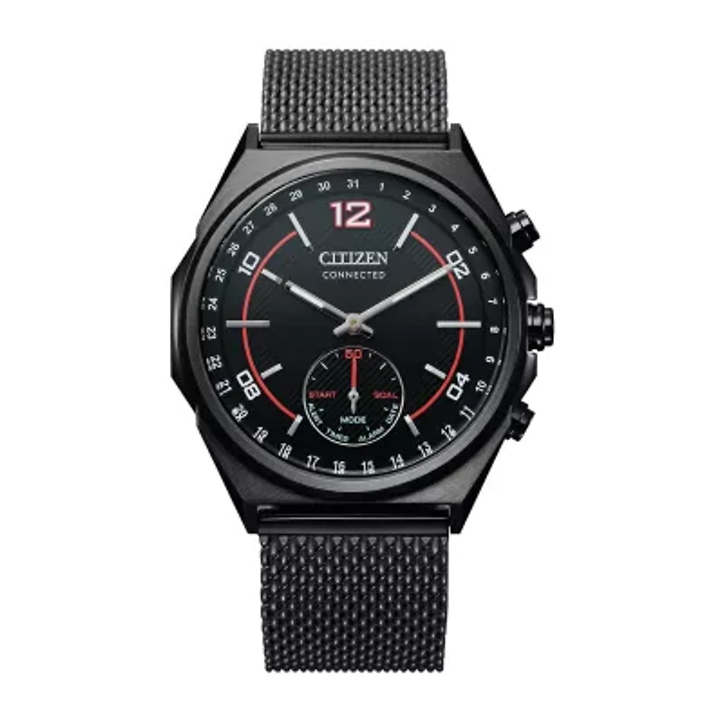 The Connected watch from CITIZEN is a hybrid smartwatch connecting to your smartphone using Bluetooth™ technology. Constructed with a black dial, black ion-plated stainless steel mesh bracelet, black ion-plated stainless steel case with three-piece case and for superior performance. Customize your functions through the Citizen Connected app – features include time/date sync, call notification and filtering, play/pause music, volume adjustment, fitness tracking, smartphone search and more. Please note this watch is NOT powered by Eco-Drive, but uses a CR2430 lithium battery.