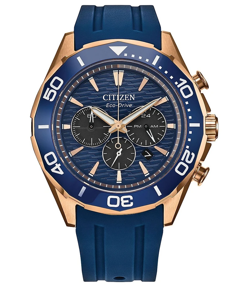 From Citizen, this men's watch features: Polyurethane strap Stainless steel case Sapphire crystal  Date window Buckle clasp closure Chronograph movement Case size approx. 43mm  Water resistance: 100M Imported.