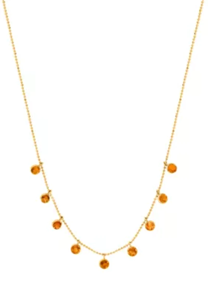 This elegant necklace from Effy® enhances any outfit with its delicate design, offering subtle sophistication that's perfect for all occasions. 9 Citrines Lobster closure Polished finish Prong setting Warranty available, limited liability warranty, lifetime Imported Product Specifications 18" L 1.88 ct. t.w. Citrine Material & Care 14K yellow gold Clean with a soft cloth