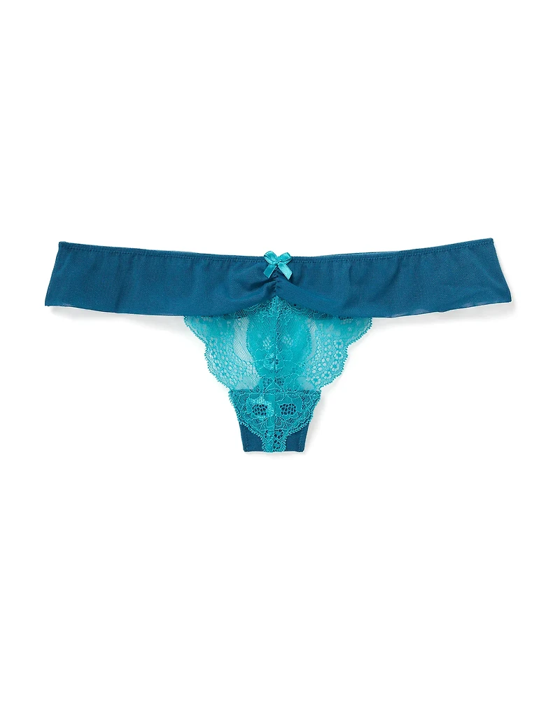 The Clairabelle Thong Medium Blue lace thong is a romantic and alluring piece. Designed for comfort in a striking thong silhouette, it features delicate lace for a touch of sophistication. - Style: Thong Panty. (Available in sizes XS-XL.)