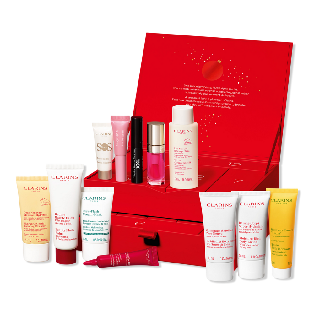 12 DAY ADVENT CALENDAR 2025. Features: Beauty Flash Balm: A multi-tasking balm 3-in-1 day cream, express face mask, and makeup primer creates radiant skin that looks instantly rested and refreshed.. Lip Comfort Oil 04 Pitaya: Enriched with a trio of nourishing plant oils to nourish, comfort, and visibly plump lips, while providing a protective shield of high-shining color.. Hydrating Gentle Foaming Face Cleanser: Moisture-rich foaming cleanser gently removes makeup and impurities while boosting hydration.. Velvet Cleansing Milk: Creamy cleansing milk purifies skin and melts away makeup and pollutants without stripping skin of moisture.. Cryo-Flash Cream-Mask: Icy-cold, gel-cream face mask minimizes pores, visibly lifts, and boosts skins radiance. SOS Primer White: Color-correcting and perfecting makeup primer that hydrates and preps skin for flawless makeup application. Total Eye Lift: A naturally powerful, all-in-one anti-aging eye cream with Organic Harungana*, a retinol alternative, to target wrinkles, crows feet, dark circles, and puffiness for a visible eye lift in 30 seconds**.. Exfoliating Body Scrub: Refreshing body scrub polishes away dry cells, flakes, and impurities while nourishing and softening the skin.. Moisture-Rich Body Lotion: Ultra-nourishing body lotion formulated with 88% natural ingredients including Shea Butter, to soften, smooth and comfort very dry skin.. Tonic Bath and Shower Concentrate: Invigorating foaming body wash infused with aromatic essential oils cleanses, softens, and energizes.. Wonder Volume Mascara XXL: Volumizing mascara for bigger, bolder lashes with 2X the volume*** and smudge-proof wear.. Lip Perfector 21 Soft Pink Glow: Nourishing lip gloss with instant 3D shimmering shine and a touch of color.. *Organic ingredients are produced in accordance with European regulation (CE 2018/848). **Self-evaluation, visible results perceived by 111 women. ***Clinical Study, 33 Volunteers, after first application. Includes: Beauty Flash Balm, Full Size (1.7 oz). Lip Comfort Oil 04 Pitaya, Full Size (0.2 oz). Hydrating Gentle Foaming Face Cleanser, Travel Size (1.0 oz). Velvet Cleansing Milk, Travel Size (1.6 oz). Cryo-Flash Cream-Mask, Travel Size (0.5 oz). SOS Primer White, Mini (0.3 oz). New Total Eye Lift Eye Cream, Trial Size (0.2 oz). Exfoliating Body Scrub, Travel Size (1.0 oz). Moisture-Rich Body Lotion, Travel Size (0.9 oz). Tonic Bath and Shower Concentrate, Travel Size (1.0 oz). Wonder Volume Mascara XXL, Mini (0.1 oz). Lip Perfector 21 Soft Pink Glow, Mini (0.15 oz). :