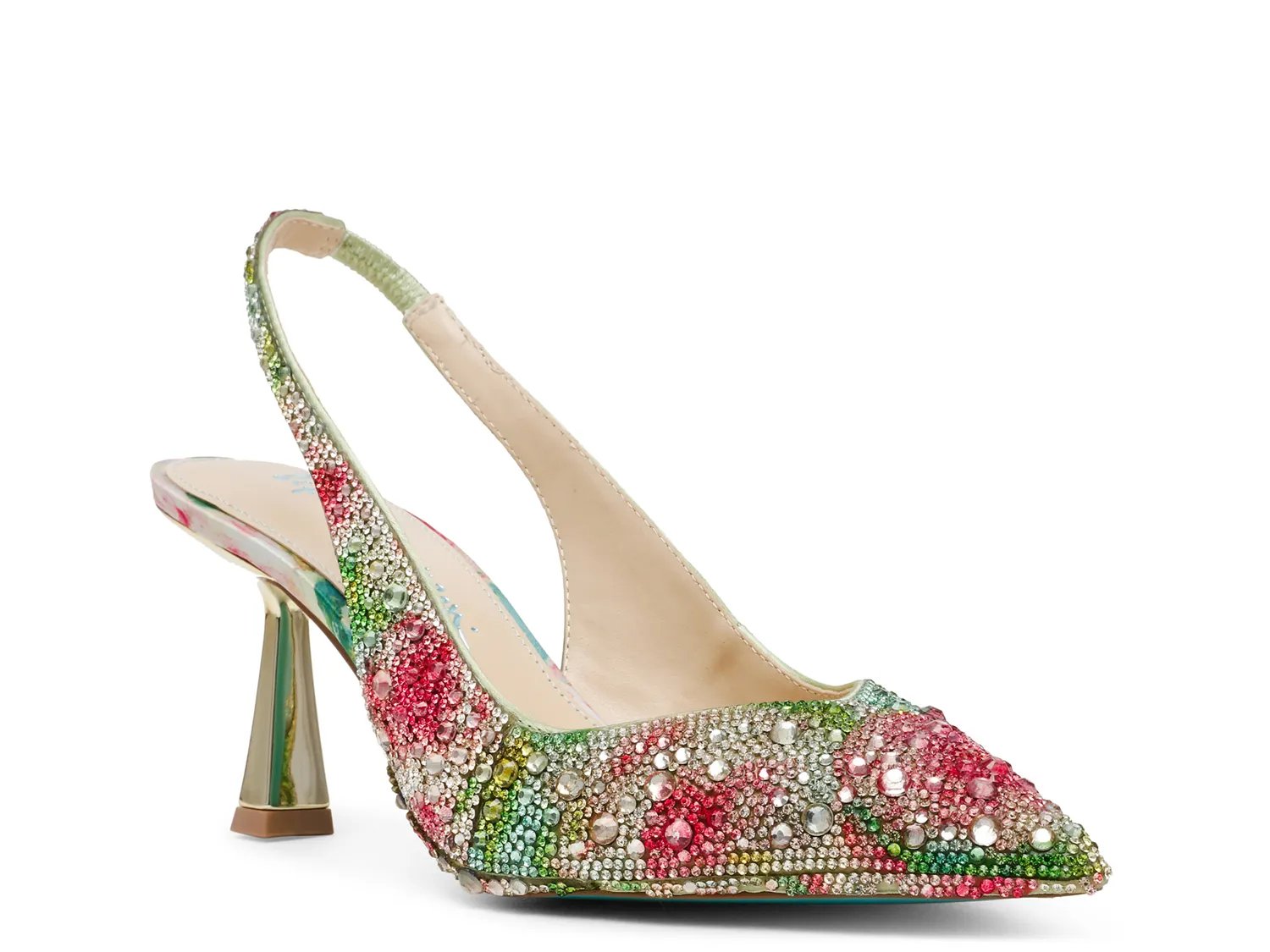 Head out in striking style wearing the Clark pump by Betsey Johnson. Featuring bright rhinestone detailing that lets your unique style shine through, this pump is designed with sharp pointed toe for a trendy look and slingback strap for a perfect fit.