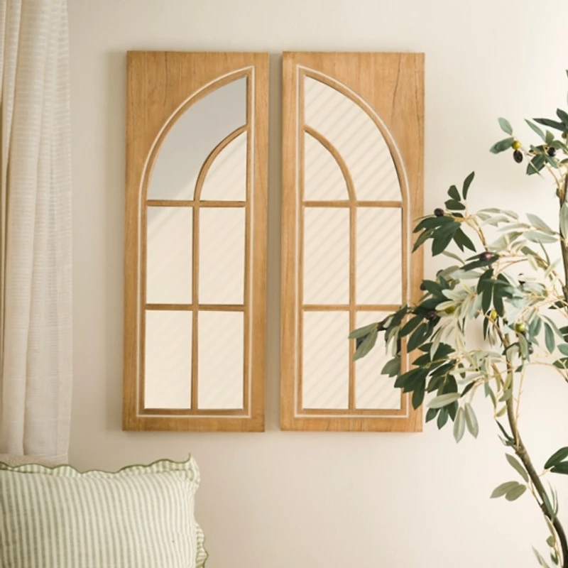 Make your gallery wall more dimensional by adding these Clarke Wood Arched Panel Wall Mirrors. With a look that blends classic style and unique charm, they will look stunning in any space! Set includes two (2) mirror panels Each panel measures Width: 11.88 in. Depth: 1.25 in. Height: 31.5 in. Crafted of wood composite and mirror Natural finish Arched mirror design Pane overlay Weight: 14.11 lbs. Hangs from back-mounted hardware Care: Dust with a soft, dry cloth. To clean mirror, spray a small amount of glass cleaner onto a lint-free cloth and wipe clean. Contact your local Kirkland's store for availability. Quantities and selection may vary by location. WARNING: Cancer and Reproductive Harm - For more information go to www.P65Warnings.ca.gov .