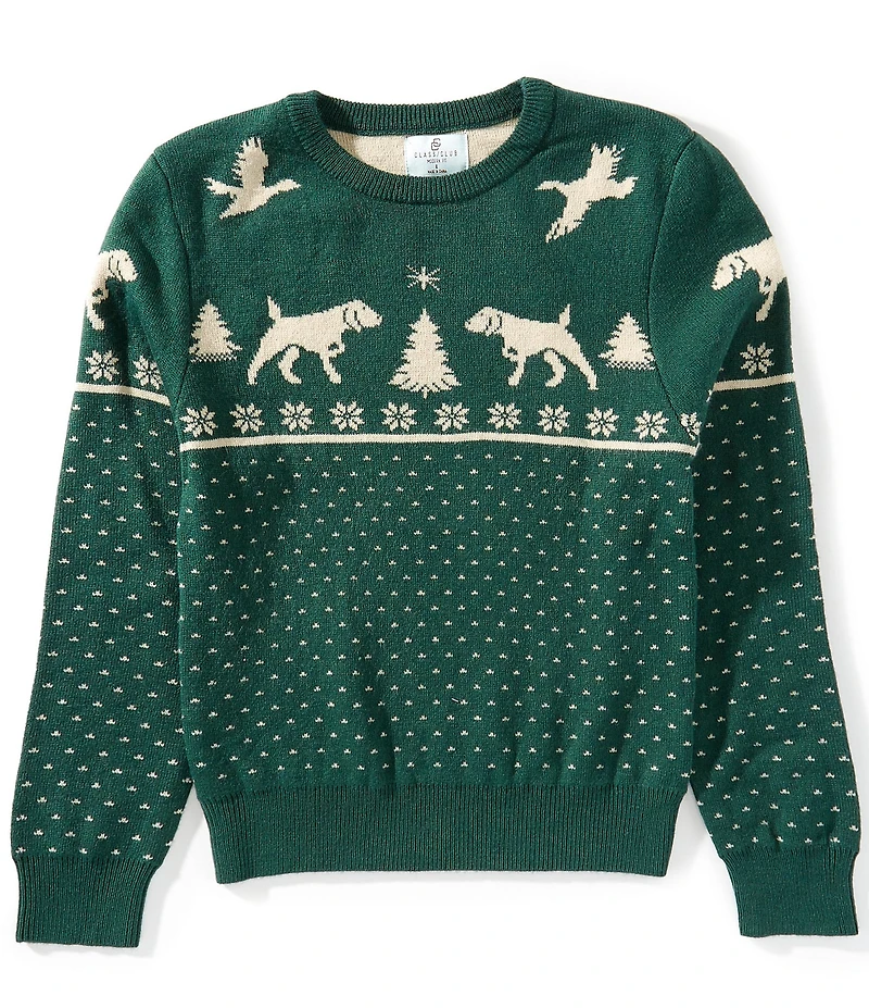 From Class Club, this sweater features: Fairisle dog and duck design Crew neck Long sleeves Pullover construction Acrylic/nylon Machine wash/tumble dry Imported.