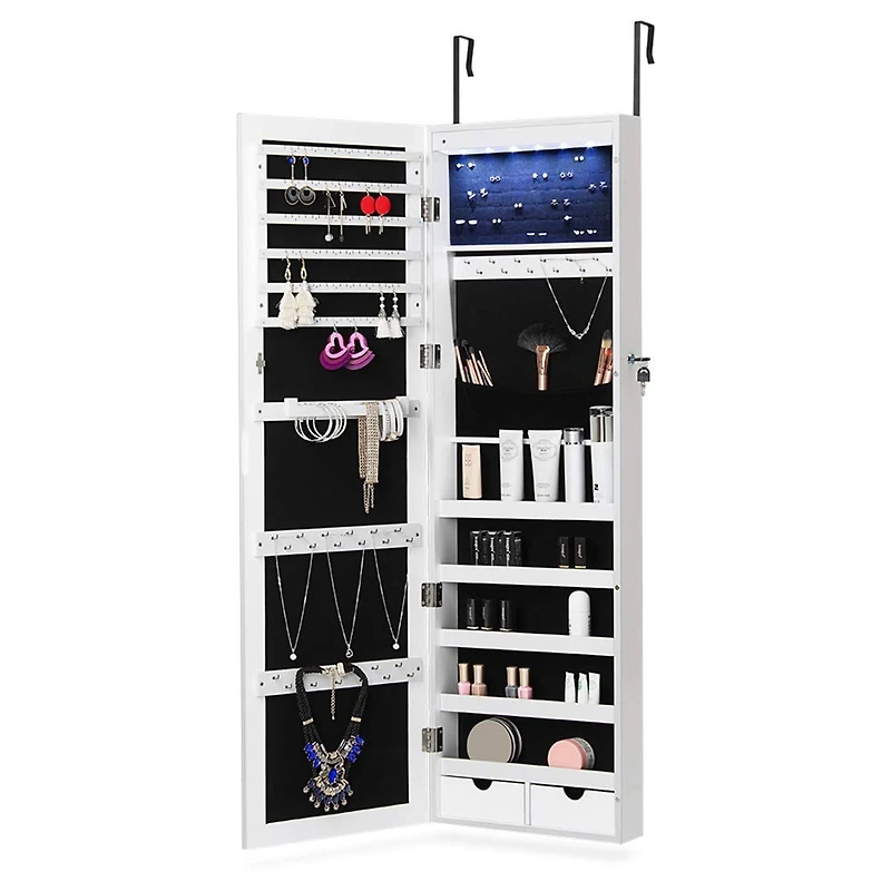 This mirrored cabinet is essential for individuals who love to wear and collect jewelry and accessories. It has a lot of storage room, able to store up to 150 accessories and it comes with a full length mirror that will help you complete your perfect outfit. This organizer is able to help individuals store all their accessories in one spot, dropping the chances of losing any accessories or jewelries. The integrated bright LED lights are also an essential to providing the best lighting when choosing an outfit and is able to help display your accessories with a unique bling. With a secured door lock, you are able to hide all your expensive accessories in a secret mirror. Equipped with a sliding door, this Door Mirror Jewelry Armoire is very easy and simple to use. You are able to stand in front of the mirror and choose the perfect jewelry or accessory that will perfect your daily outfits.Details:Classic white14.6" x 3.7" x 47.1"Mirrored front with 42" long mirrorEasy assembly requiredMDF, glass, velvet