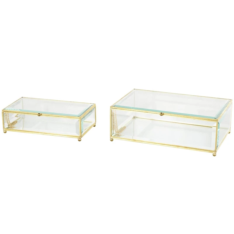 Crafted from high-quality clear glass and durable gold metal, this clear decorative jewelry box set promises both longevity and sturdiness. Each rectangular jewelry case in this set is adorned with a shiny clear glass finish, complemented by a gold metal frame and strips of blue, lending an air of elegance to any décor. This glass set of two jewelry boxes features a gold metal frame that adds an extra layer of sophistication, making them perfect for storing your precious items.Details:Clear and gold-colored10" x 6.75" x 3.55" large box size8.05" x 4.75" x 2.95" small box size5.3 lb. total set weight2 boxesBeveled glass edgesChain hinged closureGlass and metalFor indoor use only