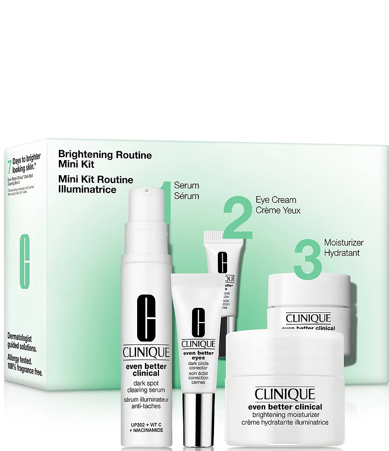What It Is A routine for brighter-looking skin, featuring Clinique’s dermatologist-developed dark spot clearing serum. A $51 value. Skin Type: All Skin Types Allergy tested. 100% fragrance free. Product Details Step 1: Serum. Even Better Clinical™ Dark Spot Clearing Serum is a powerful, dermatologist-developed dark spot serum for more even-looking skin. Step 2: Eye Cream. Even Better Eyes™ Dark Circle Corrector is a refreshing undereye cream for dark circles that hydrates and brightens the appearance of the eye area. Step 3: Moisturizer. Even Better Clinical™ Brightening Moisturizer hydrates as it helps visibly improve multiple dimensions of discoloration. Formula Facts Clinical Expertise Dermatologist tested. Allergy tested. 100% fragrance free. Free Of Fragrance Parabens Phthalates How to Use: Use Even Better Clinical™ Dark Spot Clearing Serum for dark spots twice a day, morning and night. Dispense 1 to 2 pumps onto fingertips. Spread dark spot serum all over your face. Daily sunscreen is imperative. Apply SPF in the AM after your moisturizer. Use Even Better Eyes™ Dark Circle Corrector for dark circles twice daily, morning and night. Gently squeeze a small amount of product and glide contoured applicator back and forth across the undereye area. Use finger to smooth in any excess until absorbed. Use Even Better Clinical™ Brightening Moisturizer AM and PM on clean skin. In the AM, follow with SPF. Set Includes: Even Better Eyes™ Dark Circle Corrector, 2ml Tube Even Better Clinical™ Dark Spot Clearing Serum, 10ml Bottle Even Better Clinical™ Brightening Moisturizer, 15ml Jar