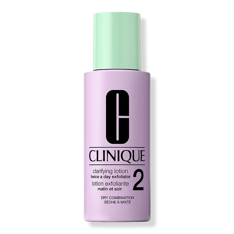 CLRFYG LTN 2 - FR DRY CMB SKN 13.5OZ. Benefits: Skin Types: Dry Combination. Sweeps away pollution, grime, dulling flakes to reveal smoother, clearer-looking skin.. For drier skin types, exfoliation whisks away surface flakes, clearing the way for moisturizer.. Dermatologist developed and tested. Allergy tested. Fragrance free. Clinique Clarifying Lotion is available in 5 skin-typed formulas. Which formula is just right for your skin?. Clarifying Lotion 1.0: Extra-gentle, alcohol-free formula is safe for sensitive skin.. Clarifying Lotion 2: Gentle for dry combination skin.. Clarifying Lotion 3: Great for combination oily skin.. Clarifying Lotion 4: Formulated for oily skin.. Did you know Cliniques exfoliating lotion is different from a toner?. Toners are primarily used to help rebalance skin after cleansing. Clinique Clarifying Lotion is formulated with exfoliating ingredients to help remove dead cells on skins surface. Clearing away that debris with Clarifying Lotion makes skin more receptive to moisturizer and treatment products.. Key Ingredients: Acetyl glucosamine: Helps balance and smooth skin.. BHA (salicylic acid): Helps clear and unclog pores.. Research Results: Cliniques Clarifying Lotion face exfoliator instantly delivers clinically proven benefits* for skin that:. Looks more radiant.. Looks smoother.. With less-noticeable pores.. *Clinical testing on 20 women..