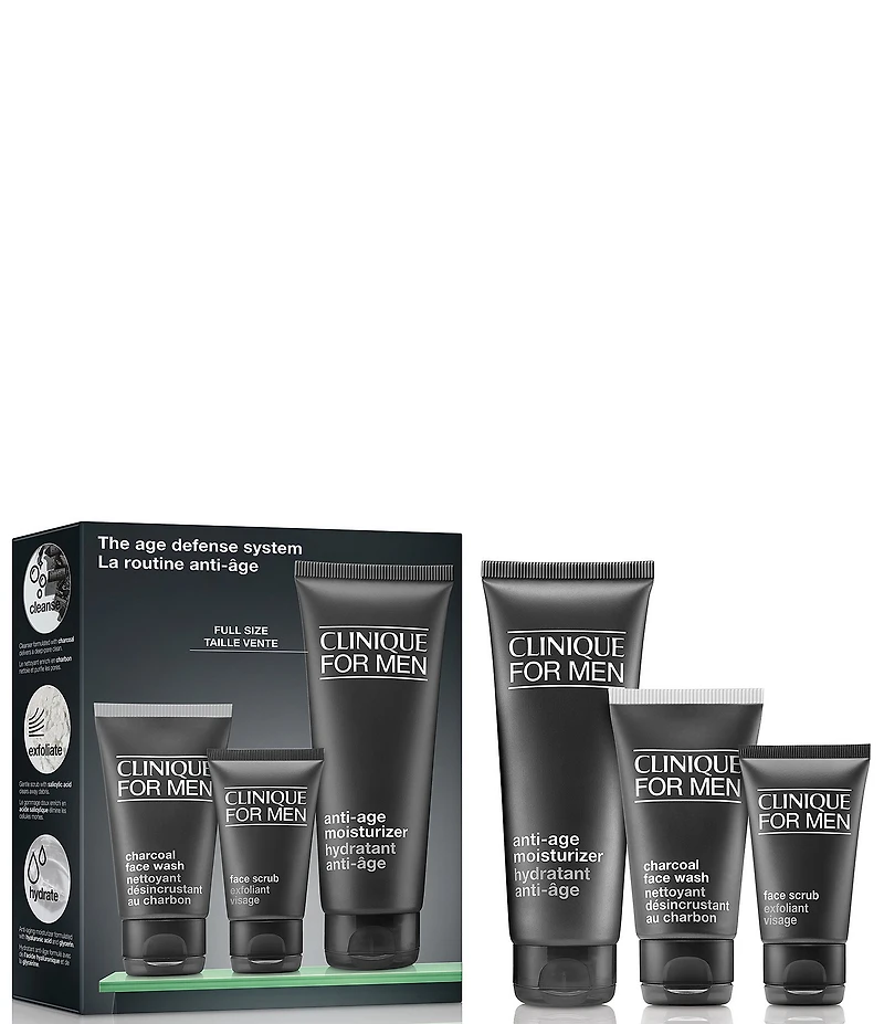 An anti-aging skincare system developed to help keep men’s skin looking fresh and younger. Includes a full-size anti-aging moisturizer. A $68 value.   SKIN TYPES:  Very Dry to Dry, Dry Combination, Combination Oily, Oily PRODUCT DETAILS: Clinique For Men™ Face Scrub revives and smooths skin to clear the way for a close shave Clinique For Men™ Charcoal Face Wash delivers a deep-pore clean. Charcoal cleanser detoxes, draws out the dirt and excess oil that can clog pores. Soothing, non-drying lather gently foams away impurities Clinique For Men™ Anti-Age Moisturizer combats the appearance of lines, wrinkles, and dullness for younger-looking skin FORMULA FACTS: Clinical Expertise Dermatologist tested Allergy tested 100% fragrance free FREE OF: Fragrance Parabens Phthalates   HOW TO USE:  Use Clinique For Men™ Charcoal Face Wash twice a day, morning and night. Lather between palms with tepid water. Massage all over damp skin to remove dirt and oil, and soften beard. Rinse well and towel dry. Apply exfoliating Clinique For Men™ Face Scrub over wet face (avoid eye area). Wet skin and rub gently until Face Scrub turns white; rinse off. Use Clinique For Men™ Anti-Age Moisturizer twice a day, morning and night. Smooth over clean face and neck, avoiding eye area.    SET INCLUDES: Full Size Clinique For Men™ Anti-Age Moisturizer, 3.4-oz. Clinique For Men™ Face Scrub, 1.0-oz. Clinique For Men™ Charcoal Face Wash, 1.7-oz.