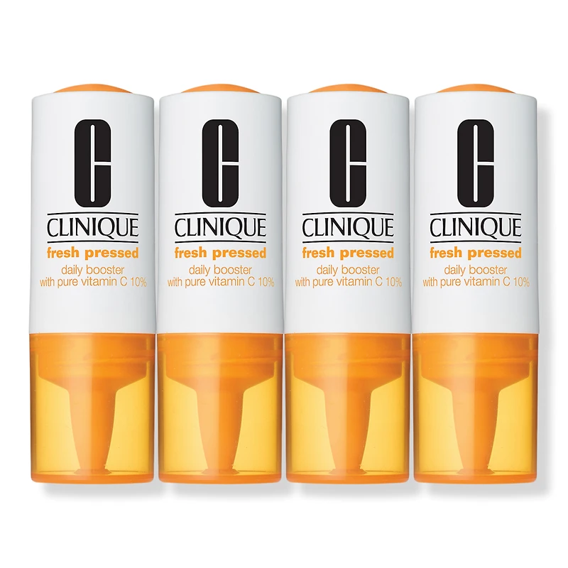 FRSH PRSD DY BSTR W/ PR VTMN C 10% 1.1OZ. Benefits: All Skin Types.. Unique de-aging Booster harnesses the full power of pure, fresh Vitamin C at Clinique's highest concentration to brighten, even, and retexturize skin.. Just like your morning fresh-pressed juice or vitamin helps you stay healthy on the inside, this super-potent Booster was designed as a daily supplement to visibly rejuvenate skin from the outside.. Mix it with your favorite moisturizer AM & PM and see:. Brighter skin with first application.. Reduction of age spots.. Reduction in the look of lines and wrinkles over time.. Dermatologist and ophthalmologist tested.. Non-acnegenic.. Allergy tested.. Formulated Without: Parabens. Phthalates. Oil-free. Denatured alcohol. Synthetic colors. SLS. SLES. Sulfates. Fragrance. :