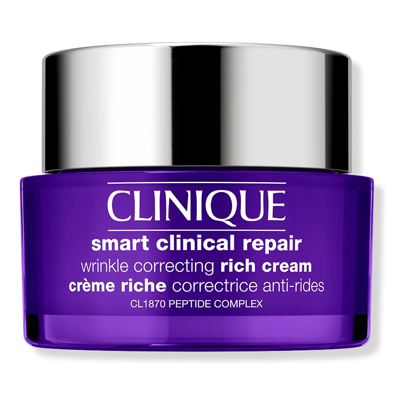 CLMRTCLCLRPRWRKLCRCTGCRMVRYDRYTDR 4.33OZ. Benefits: Strengthens, visibly repairs lines and wrinkles, hydrates. A powerful addition to Clinique's most advanced de-aging line yet, Clinique Smart Clinical Repair, this ultra-nourishing moisturizer is engineered to visibly reduce lines and wrinkles for supple, younger-looking skin.. Cutting-edge formula with CL1870 Peptide Complex helps boost skin's natural collagen to help fortify the dermal structure, leaving skin feeling stronger and looking smoother.. Moisturizer plumps skin with lasting hydration.. Available in two textures: Wrinkle Correcting Cream is a lightweight cream for All Skin Types and Wrinkle Correcting Rich Cream is a luxe, denser cream for those with drier skin.. Built on Dermatological Science: As a dermatologist-guided brand, Clinique's commitment to safety starts with skincare science. Clinique partners with the best minds in dermatology and formulate for all skin types, tones, concerns - in service of all skin.. Fragrance-free, Paraben-free, Phthalate-free, Oil-free, Free of synthetic colors.. More Responsible Packaging:. 50ml and 15ml jars each contain a minimum of 30% post-consumer recycled content.. Carton is made from responsibly sourced paperboard. Please recycle.. Key Ingredients: Formulated with peptides to help boost skin's strength for a smoother appearance and hyaluronic acid to help hydrate skin.. CL1870 Peptide Complex: An expert peptide blend engineered to fight the look of wrinkles by boosting natural collagen, which helps strengthen skin's natural support structure.. Hyaluronic acid: Exclusive formula uses two molecular weights of hyaluronic acid. This intense humectant helps flood your skin with hydration -and holds on. Helps restore suppleness and visibly smooth fine, dry lines.. Soybean seed extract: An ingredient rich in lysophosphatidic acid (LPA), which nourishes to help fortify skin.. Shea butter: Found in the Rich Cream, it contains lipids that form skin's barrier and is integral to keeping drier skin hydrated.. :