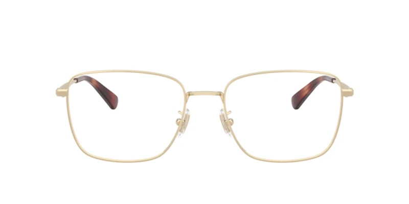 The coach hc5205 optical glasses feature sleek metal square glasses frames, defined by sharp angles for a modern and structured look. Finished with gold frames at the front and sculpted c logo accents on the temples, they exude refined style. Adjustable nose pads and a saddle bridge ensure superior comfort and fit.