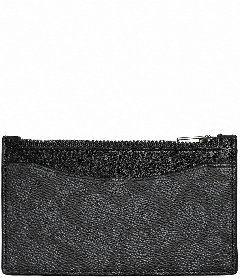 From COACH, this card case features: Signature coated canvas/refined calfskin leather Five credit card slots Zippered closure One size, 5” long x 2.75” tall Signature coated canvas/refined calfskin leather Spot clean Imported.