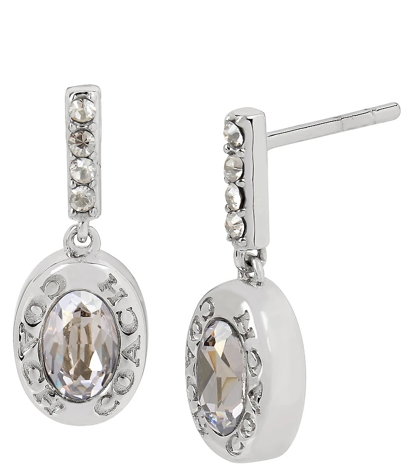 From COACH, these earrings feature: Drop earrings Brass/Crystal Oval-shaped drop earrings with crystals Detailed with COACH engraved signature logo on the outer edge and a pave embellished bar Sterling silver post Post back closure Includes a COACH gift box Approx. 0.75" L x 0.3" W x 0.1" D Imported.