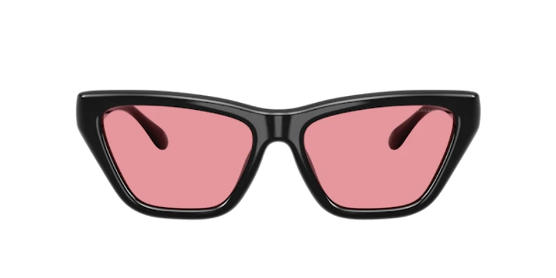 Elevate your style with the hc8449u cdp33 black sunglasses from coach. Inspired by the iconic pillow tabby concept, these black plastic cat-eye frames offer angular edges and bold contours for a statement look. Sculpted injected temples enhance their design, while solid pink lenses add a modern touch. Designed with a standard bridge and sunglasses with a universal fit for effortless comfort.