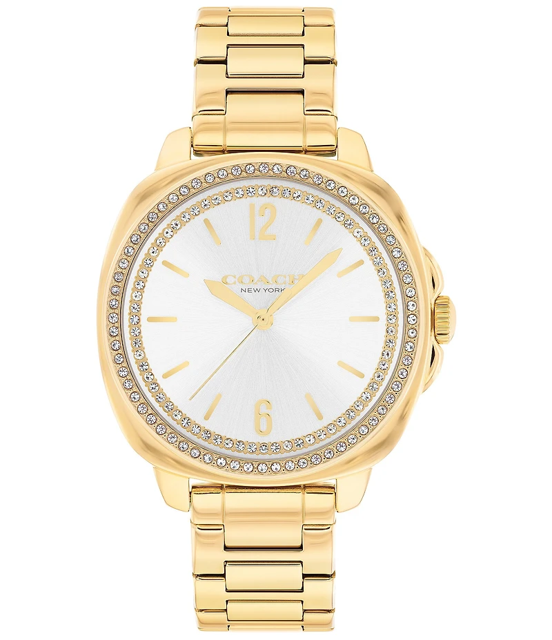 From COACH, this women's watch features: IP gold stainless steel bracelet and case Silver white dial Mineral crystal Deployment closure Quartz analog movement Case approx. 34mm Water Resistance: 3B Imported.