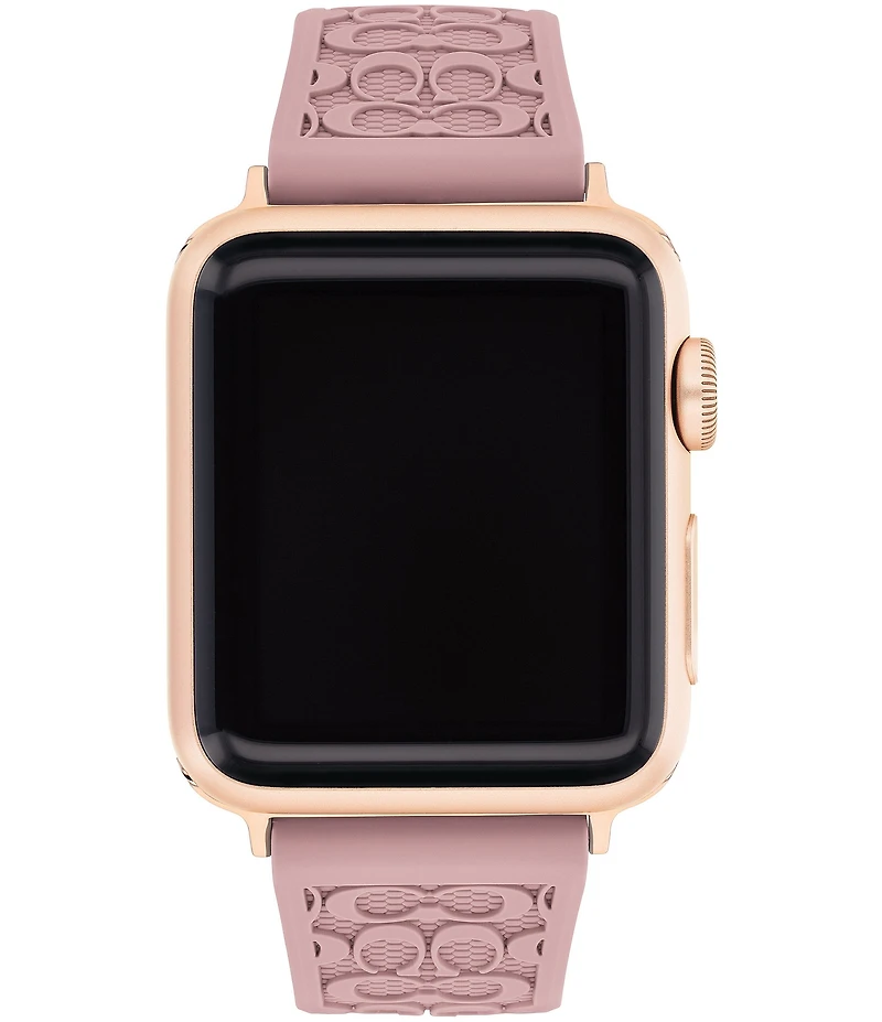 From COACH, the Women's Signature Rose Gold Buckle Pink 38/40mm Bands for Apple Watch® features: Pink rubber band Single prong strap, rose gold buckle closure Band width approx. 38/40mm Made specifically for use with the series 1, 2, 3, 4, 5, or 6 Apple Watch® Fits both 38mm and 40mm styles Apple Watch® is a trademark of Apple, Inc. Imported.