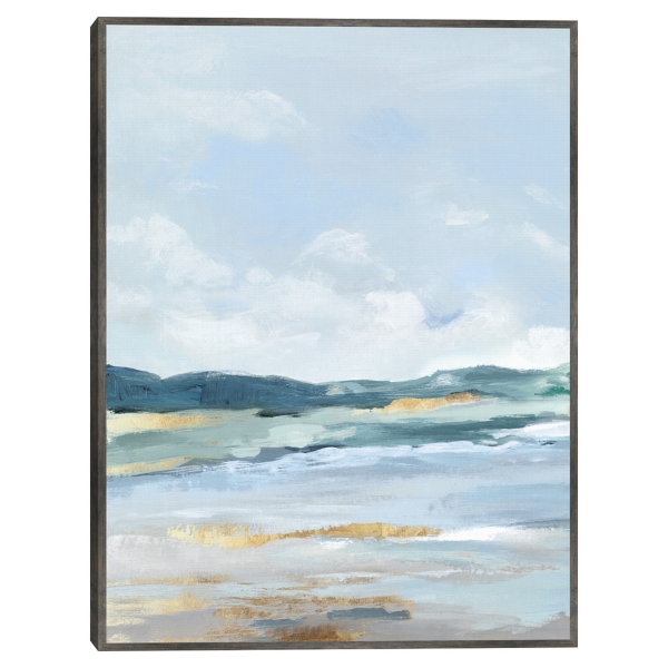 You can almost feel the sea breeze radiating through this Coastal Blue Mountains II Framed Canvas Art Print. Hints of gold shimmer peek through the ocean waves, adding an alluring finishing touch. Framed print measures 31L x 1.5W x 41H in. Giclee printed on stretched, polycotton blend canvas Black frame around wrapped canvas Abstract coastal and mountain subject Hues of blue, white, and gold Artist: Luna Mavis Weight: 7 lbs. Hangs from back-mounted hardware; sawtooth hangers included Made in Mexico Care: Dust with a soft, dry cloth. This item is available at Kirklands.com only, not available in stores. Please note: this item cannot be shipped to APO/FPO addresses. WARNING: Cancer and Reproductive Harm - For more information go to www.P65Warnings.ca.gov .