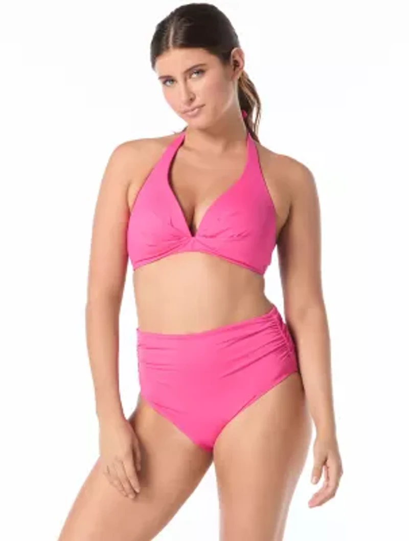 A feminine bikini top in flirty solids. Adjust the halter neckline and back for double the comfort. Mix and match with coordinating printed and solid swim bottoms and cover ups for a complete look. Bra Sizing Imported Material & Care Nylon/Spandex Hand wash