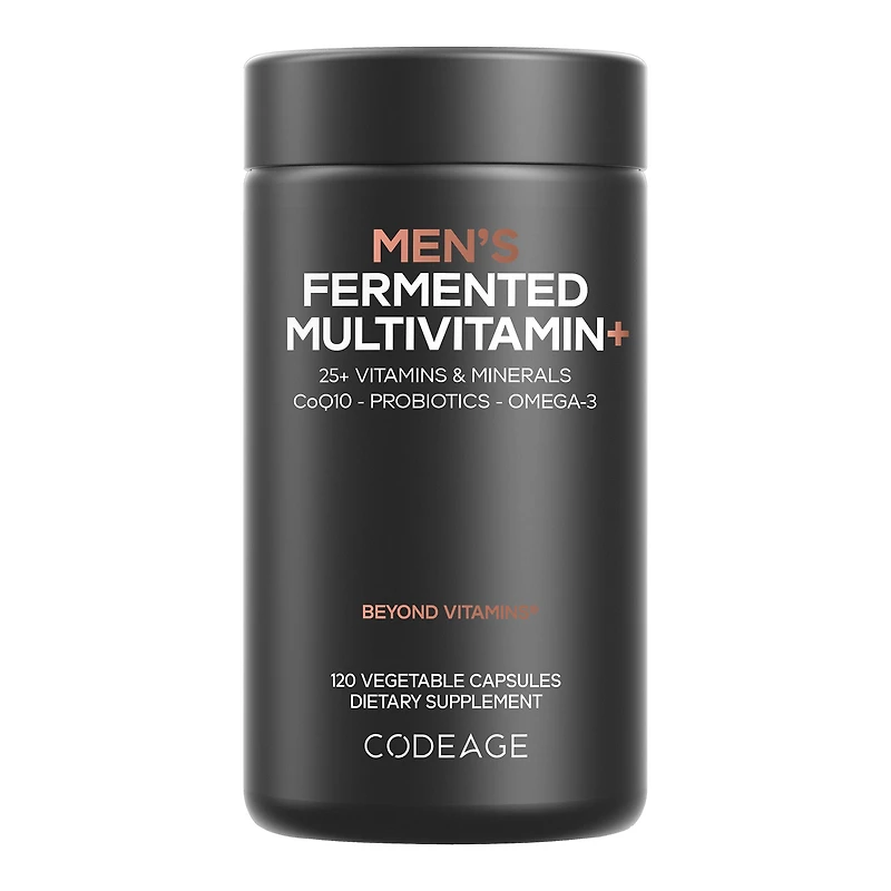 Codeage men multivitamin: methylated vitamins codeage daily multivitamin for men supplement offers essential vitamins a, b6, b12, c, d3, e, and k2, minerals like calcium and magnesium, and key nutrients like biotin, folate, iodine, iron, omega-3, lutein, and phosphorus, plus zinc, selenium, copper, niacin, and activated minerals. Formulated with whole foods, fermented herbs, probiotics, digestive enzyme blend, and coq10. Codeage all-in-one men's multivitamin supplement includes essential vitamins a, b6, b12, and c as well as vitamins d3, e, and k2 (mk-7). This multivitamin for men also offers minerals and nutrients such as biotin, folate, iodine, iron, calcium, magnesium, manganese, omega-3, lutein, and phosphorus, plus zinc, selenium, copper, niacin, and activated minerals. Codeage daily vitamins for men supplement is enhanced with real whole foods vitamins and fermented herbs, including boron, thiamin, riboflavin, chromium, molybdenum, pantothenic acid, organic ginger, beet, cordyceps, and reishi mushrooms to provide added nutritional benefits. These men's vitamins also feature probiotics, a digestive enzyme blend, organic turmeric, black pepper powder, and coq10 to elevate this formula further. Codeage daily multivitamin for men supplement is vegan, non-gmo, dairy, soy, and gluten-free. Codeage fermented men's daily multivitamin is manufactured in the usa with global ingredients in a cgmp-certified facility for quality and purity. A men's vitamin formula is also available in liposomal liquid sachets for convenience and bioavailability. . Codeage men's fermented multivitamin gluten-free - 120 capsules (60 servings)