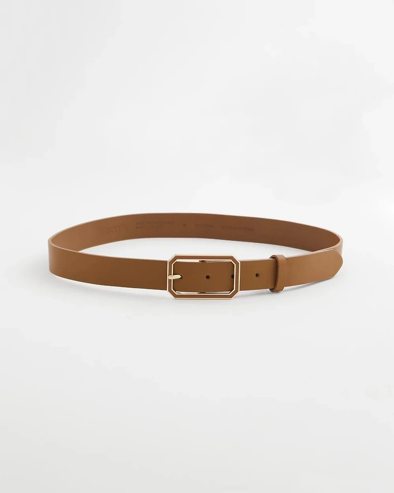 Showcasing a sleek rectangle buckle with chic cognac enamel. This faux leather trouser belt is made in a must-have hue that will match with anything.