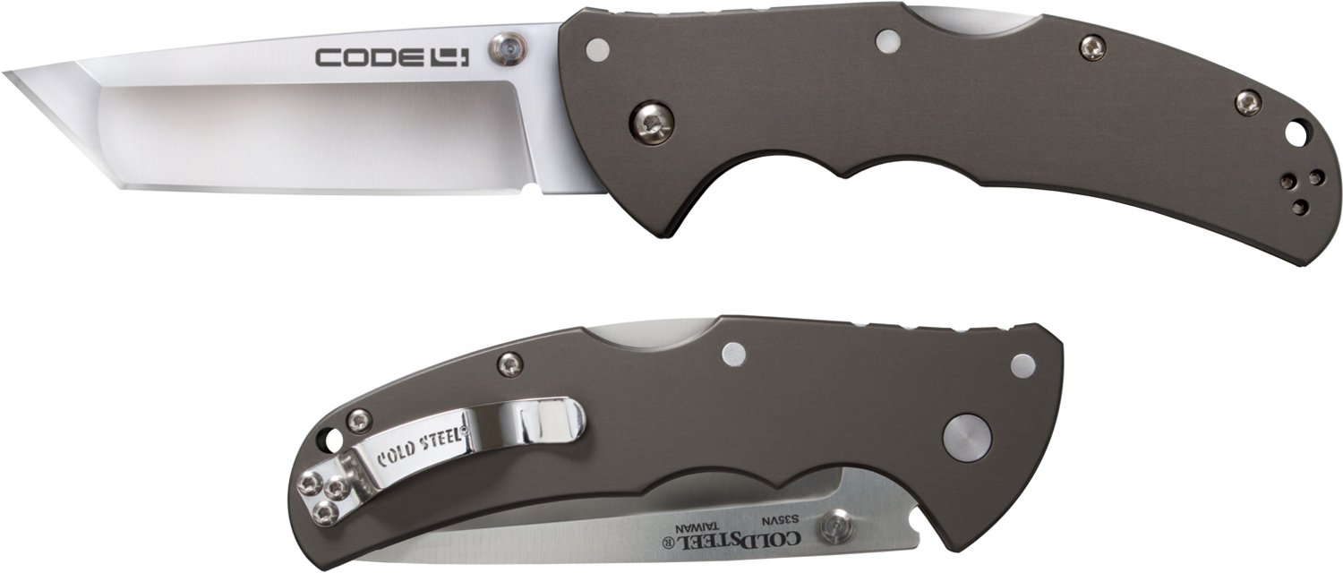 The Cold Steel Code-4 Tanto Point Knife is a knife designed for lightweight carry, with a S35VN blade and anodized aluminum grip. It features a Tri-Ad locking mechanism for safety in your pocket or in your hand.