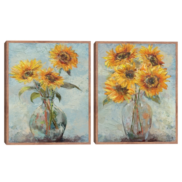 Brighten up your wall decor with these Collected Sunnies Framed Canvas Prints. The friendly flowers will instantly make any space a little more cheerful! Set includes two (2) framed canvas prints Each framed print measures Width: 23 in. Depth: 1.5 in. Height: 29 in. Distinctively printed on stretched canvas Brown wood frame around wrapped canvas Sunflower subjects Hues of yellow, blue, green, brown, and gray Weight: 12 lbs. Hangs from back-mounted hardware; sawtooth hangers included Care: Dust with a soft, dry cloth. This item is available at Kirklands.com only, not available in stores. Please note: this item cannot be shipped to APO/FPO addresses. WARNING: Cancer and Reproductive Harm - For more information go to www.P65Warnings.ca.gov .
