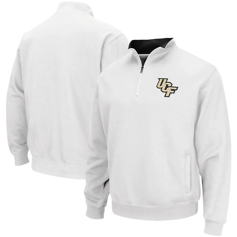The Men's Colosseum White UCF Knights Tortugas Logo Quarter-Zip Pullover Jacket is the perfect way to show your support for the UCF Knights Made of a soft cotton and polyester blend this midweight jacket offers all-day comfort The embroidered Tortugas logo on the chest proudly displays your team spirit while the Olympic collar rib-knit cuffs and waistband add a stylish touch Whether you're cheering on the Knights at the game or relaxing at home this jacket ensures both warmth and comfort
