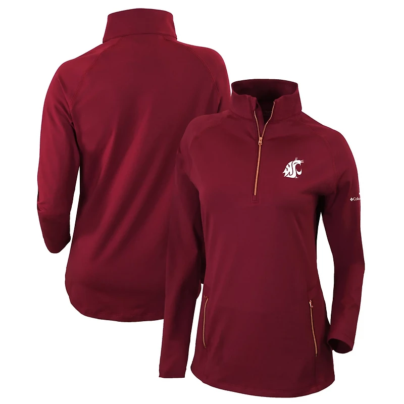 Show your Washington State Cougars spirit with this Columbia Outward Nine Quarter-Zip Pullover Top This lightweight pullover is perfect for mild temperatures and the quarter-zip closure and raglan sleeves make it easy to move around in The heat-sealed Washington State Cougars graphics and rose gold zipper add a touch of style while the UPF 30 sun protection keeps you safe from the sun's harmful rays Whether you're cheering on the Cougars at Martin Stadium or just relaxing at home this pullover is the perfect way to show your team spirit