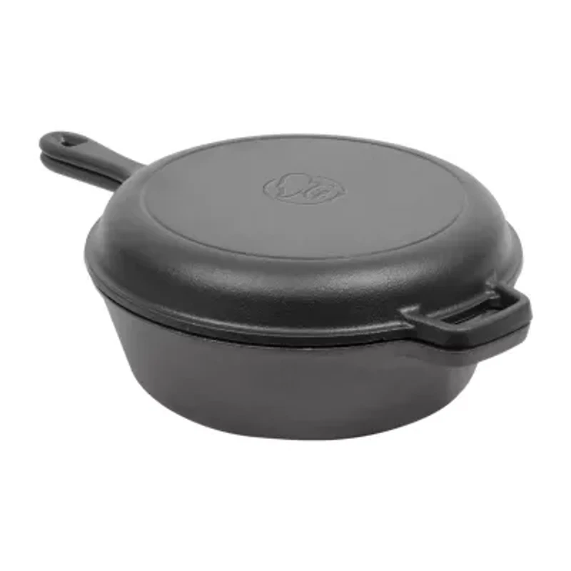 Dutch oven with tight-fitting skillet lid is perfect for a variety of cooking needs. 3-qt Dutch oven makes lamb, chicken, pork or even risotto to perfection. The removable lid doubles as a skillet for sautéing on the stovetop or baking in the oven. Pre-seasoned for easy cooking and cleaning needs. Simply wash, dry and rub with cooking oil. Durable cast iron retains heat and provides an even cooking surface throughout. Easy grip handles. Measures 16.6" x 10.6" x 4.6" overall. Weighs 11.5 lbs