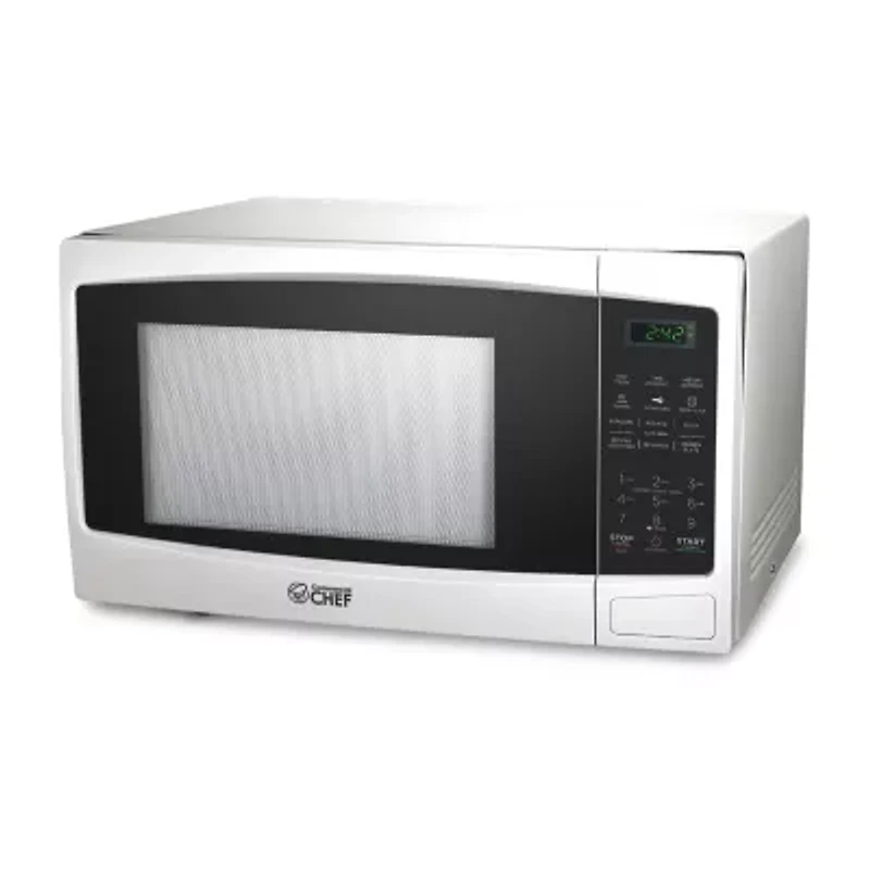 Heat and re-heat your favorite foods and beverages with this outstanding COMMERCIAL CHEF microwave oven countertop. With an impressive capacity of 1.1 cubic feet, this 1000 watt microwave oven ensures you can grab and go with delicious meals. Our fantastic white microwave countertop (20.2" x 15.7" x 12.1") will fit easily on kitchen countertops in homes, apartments, RVs, dorms, and more. Weighing only 32 lbs., you can transport this portable microwave anywhere so heated food and drink is within reach. This small microwave oven has impressive power levels such as Time Cook, Time Defrost, Weight Defrost, & Power. Preset Menu Options include Popcorn, Potato, Pizza, Frozen Vegetable, Beverage, & Dinner Plate. Also included on the digital display is Clock & Kitchen Timer. Our small countertop microwave and microwave 1.1 cu ft will heat from as little as 30 seconds to as long as you desire! When it comes to microwave ovens 1000 watt, our additional features are superior, including a door-style push button, an efficient turntable that guarantees even heating, child safety lock, yellow & green LED lighting, and sophisticated white plastic design. What's not to love about this COMMERCIAL CHEF microwave 1000 watt countertop? Its reliable heating ability, impressive functions & settings will have you heating and re-heating throughout your busy day!
