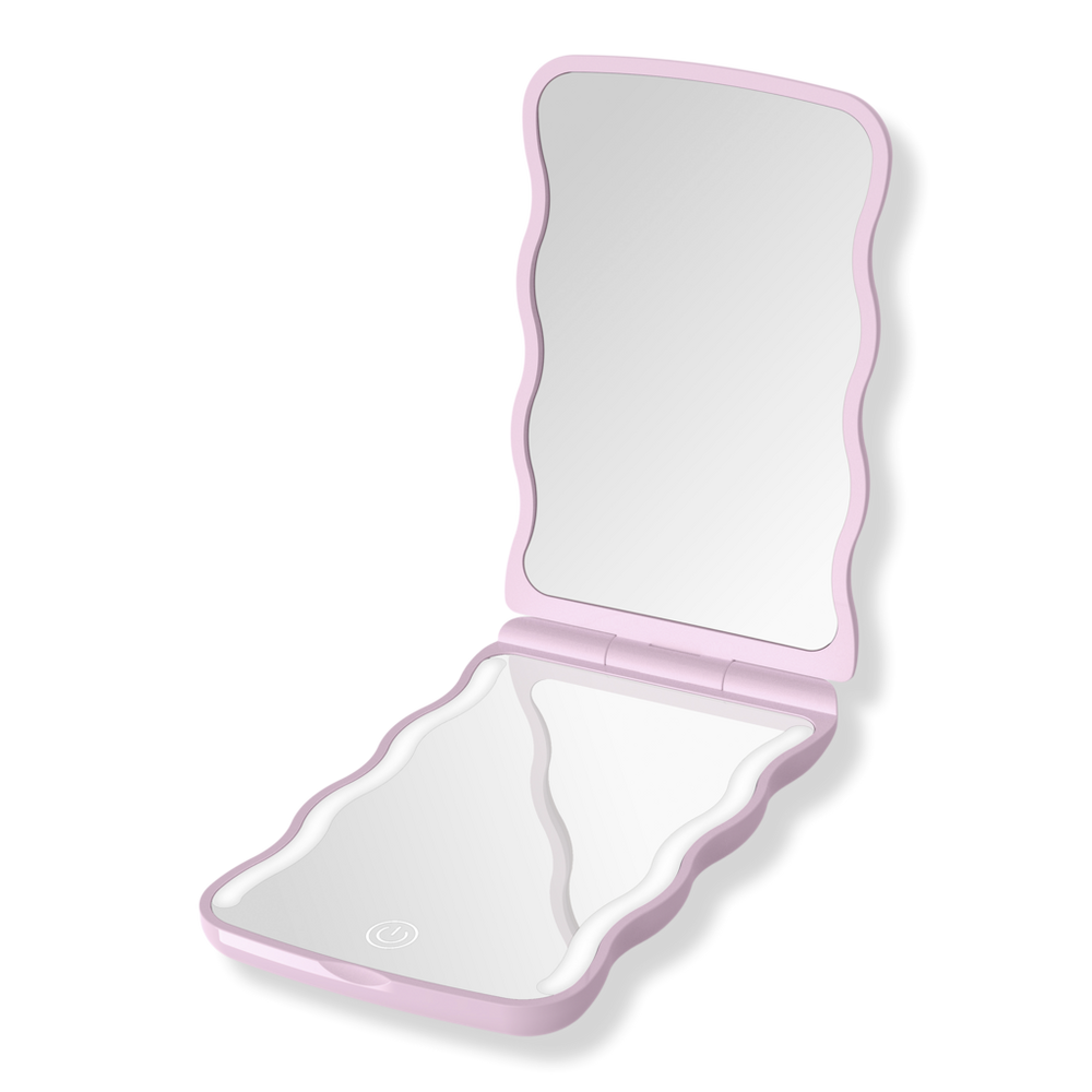 COMPACT LED WAVY MIRROR. Features: LED Halo Lighting: Provides soft, natural illumination for flawless makeup application and grooming.. 1x/3x Magnification: Easily switch between 1x for everyday use and 3x for detailed tasks like tweezing and applying eyeliner.. Battery Operated: Includes 2 CR2025 coin batteries (3V DC) for long-lasting power and portability.. On/Off Touch Button: Easy-to-use touch button for convenient operation.. Sleek, Stylish Design: Elegant lilac blush color and wavy shape make this mirror a chic addition to your beauty essentials.. Compact & Portable: With a slim profile (2.7" x 4.2"), it fits perfectly in any handbag or travel bag.. Dimensions: 2.9 L x 0.6 W x 4.7 H (when closed). : :