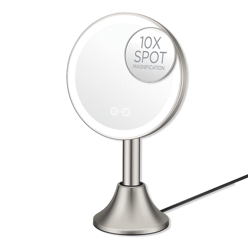 HALO RECHARGEABLE HANDHELD MIR STN NCKL. Features: 1x/10x spot magnification. 3 Light/3 Mode Settings navigate + control light intensity with the touch of a button. When not in use, easily use charging base for storage. Dimensions: 5.5" x 8.5" x 15". Benefits: Sleek & Modern Design turning your traditional vanity mirror into a 2-in-1 with rechargeable handheld design. Includes: Corded Charging Base.