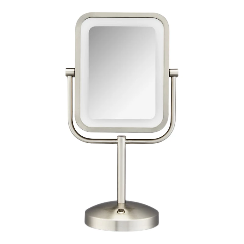 LED LIGHTED 8X MAG MIRROR OBLONG. Benefits: Double-Sided 1x/8x Magnification. Oblong Square Design. 3 Light Settings Select low, medium or high at the touch of a button and reveal yourself in soft, even lighting so you can easily achieve a flawless look for any occasion.. Lifetime LED Lighting: Experience clear, energy-efficient illumination with light bulbs that never need to be replaced.. 360 degree Rotation: Versatility and easy positioning for your perfect makeup routine.. Features: Battery Operated: Cordless power keeps countertops neat and makes the mirror easy to take on the go.. Uses 3 AA batteries (not included).. 1x/7x Magnification: Double-sided design lets you switch seamlessly from 1x magnification for full view and 7x magnification for close-up work.. Dimensions: 7.5" x 5.5" x 14.5". :