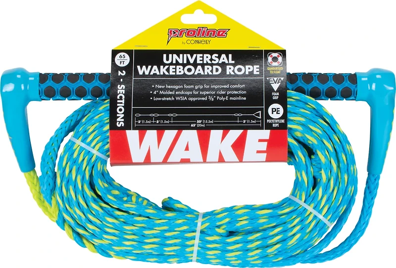 Let it rip on the water with the Connelly PROLINE 65 ft Universal Wakeboard Rope. The hexagon foam grip offers improved comfort, while the 4 inch molded endcaps help prevent handle roll. The low-stretch WSIA-approved Poly-E mainline affords durability.