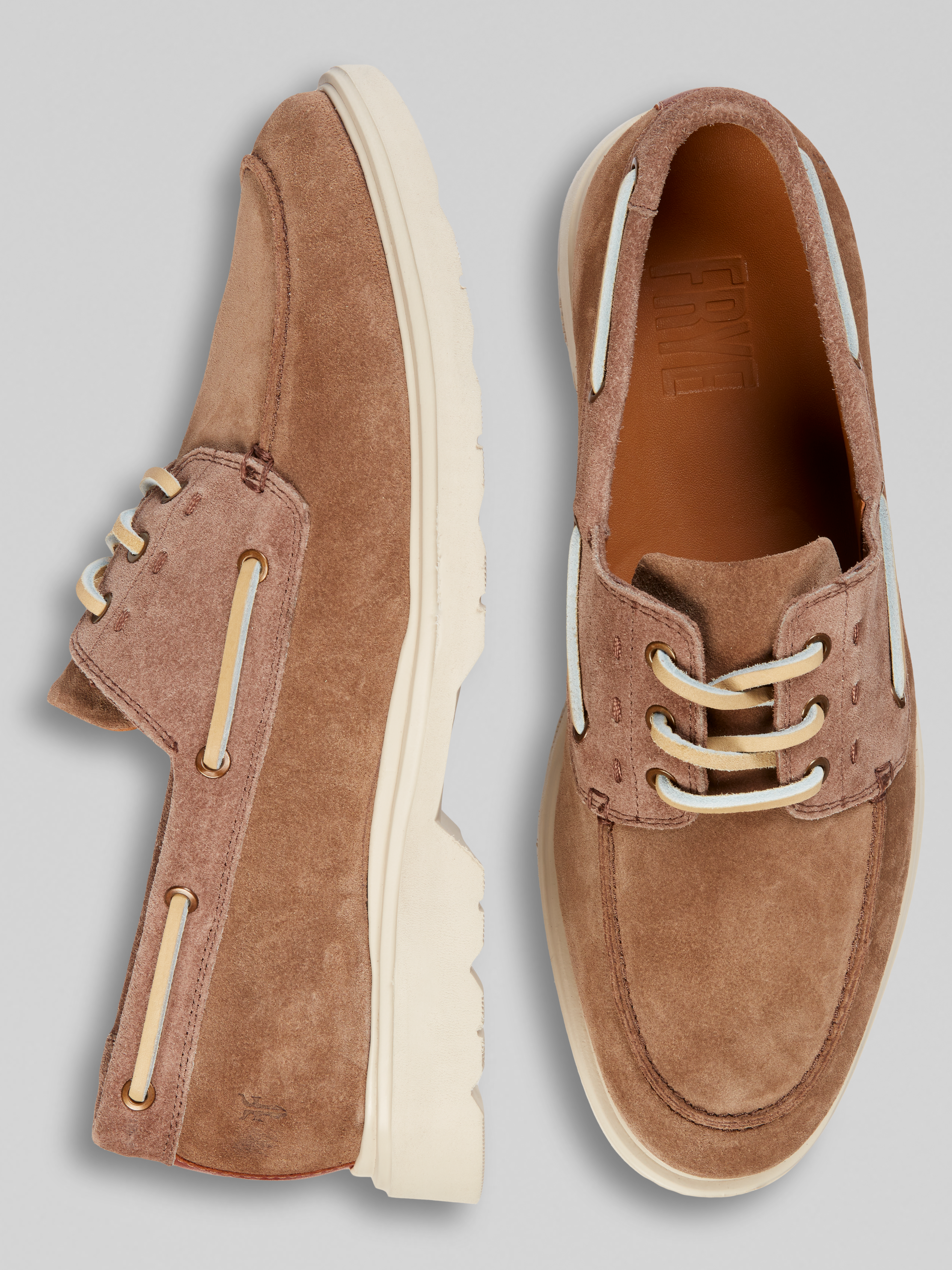 Set sail in style with these Connor leather lace-up boat shoes. Featuring a high-vamp design and an apron-toe detail, they combine a sleek, laid-back vibe with undeniable comfort. The flexible rubber sole guarantees steady traction, whether you're cruising the deck or hitting the streets. Embossed logo embellishments and smooth-fabric accents bring that extra touch of Frye sophistication. Crafted for adventure, yet versatile enough for everyday life, these shoes are your new go-to for that effortlessly polished, casual footwear game. Pair them with chinos or rolled-up jeans for major style points. Anchors away - your wardrobe just leveled up!