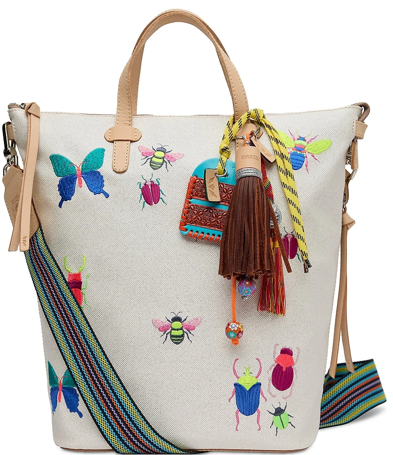 From Consuela, this bucket bag features: Shimmery pearl glitter with colorful insect embroidery exterior Zipper closure  Interior slide pocket, zipper pocket, credit card slots, and hook-clip lanyard  Exterior side zip pocket  Includes two detachable straps Adjustable woven crossbody strap approx. 13" - 22" drop  Approx. 10" W at the base, 14" W at the top x 13" H x 6" D Imported.