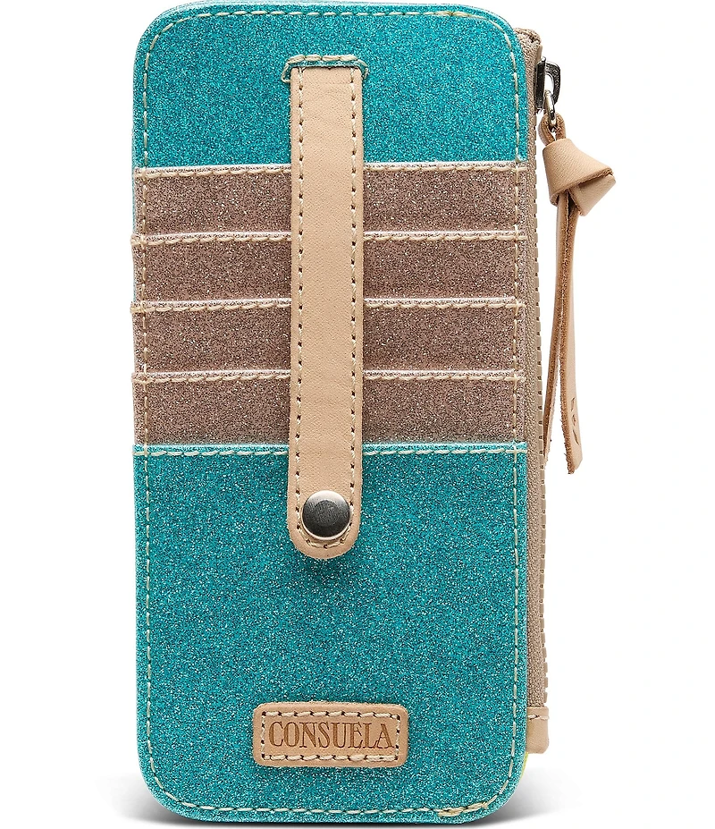 From Consuela, this card case features: Turquoise glitter exterior Trimmed in natural, untreated leather Zippered compartment to keep cards Snap closure Five card slots and ID pocket Approx. 3" W x 7" H Imported.