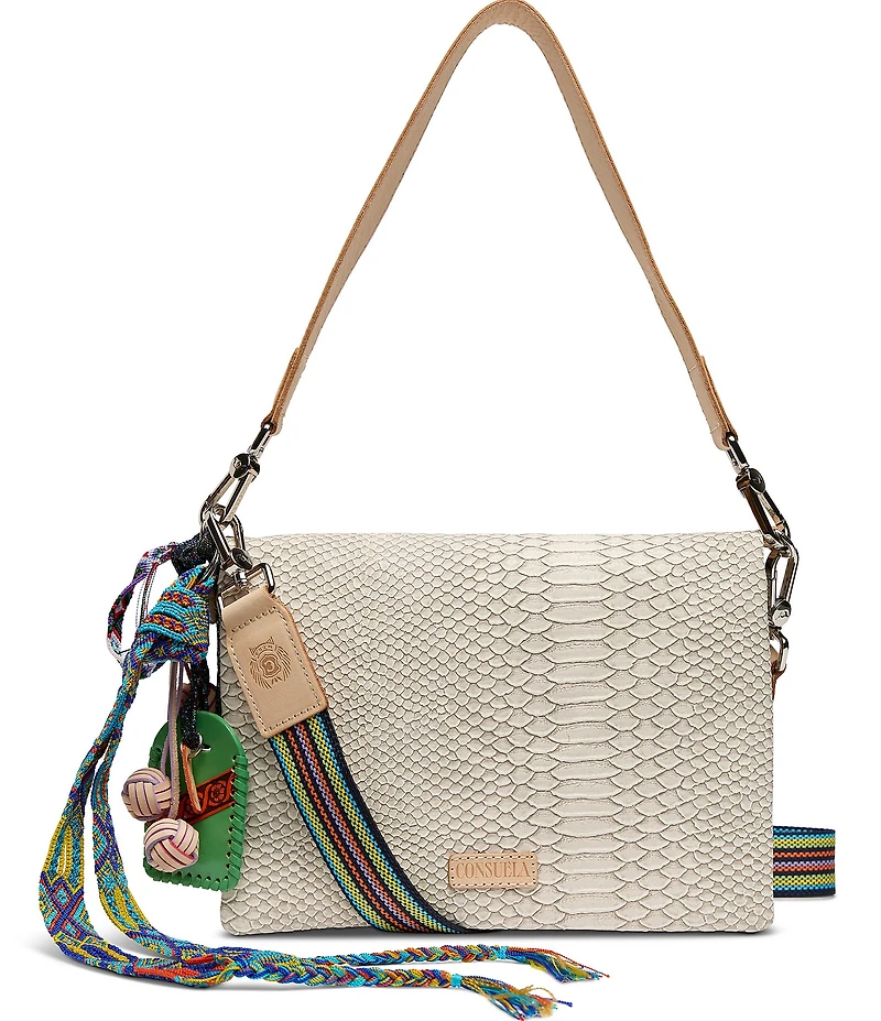 From Consuela, this crossbody bag features: Thunderbird reptile-inspired textured exterior Trimmed in natural, untreated leather Fold-over construction with magnetic closure 2 interior zipper compartments Exterior zipper compartment Six card slots ID window Included detachable shoulder strap and adjustable woven crossbody strap Approx. 10" W x 8" H x 1" D Imported.