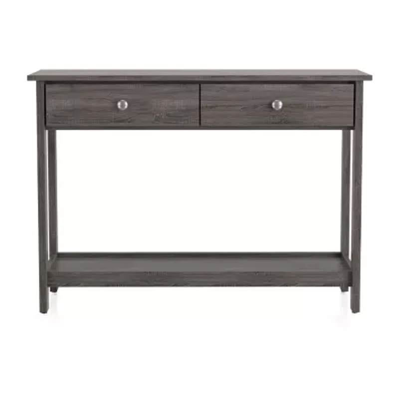 Create a stylish seating area around this transitional console table that features a rectangular profile and is perfect for displaying decor and adding storage in an entry or behind a sofa. Perfect for a casual living space, the table features wooden construction and a gray wood grain finish with a silver-toned, round knob drawer pull. This console table also includes a lower shelf, perfect for showing off beautiful books and decor or adding storage.